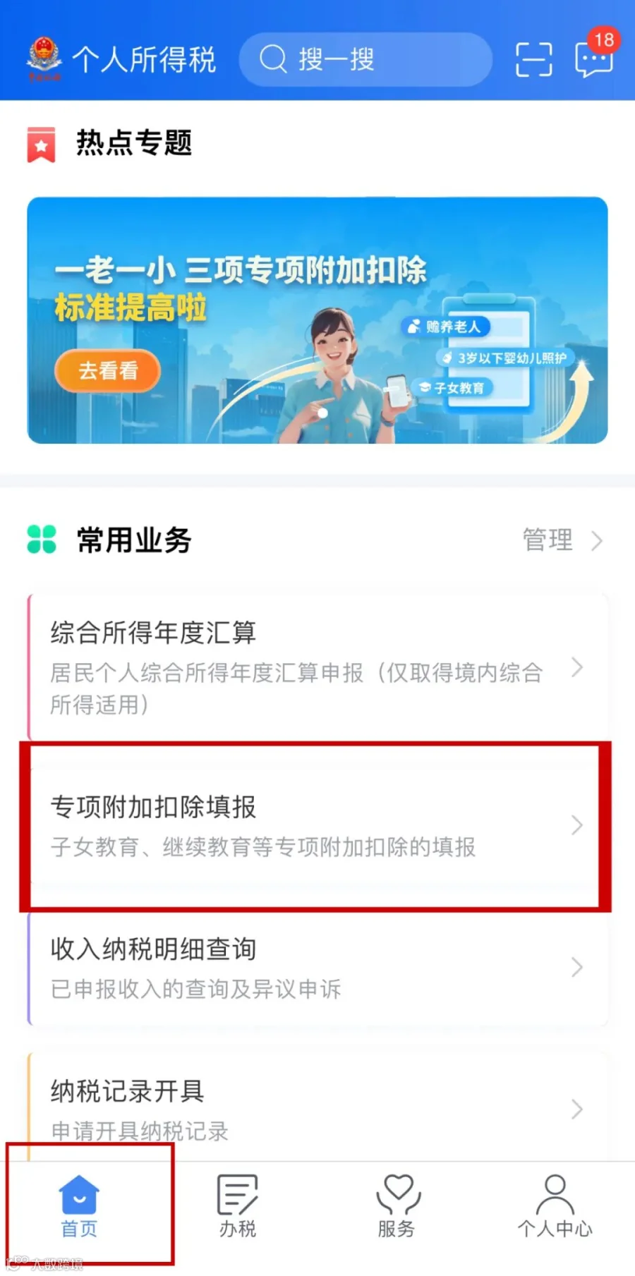 点击页面下方的【首页】→【专项附加扣除填报】;