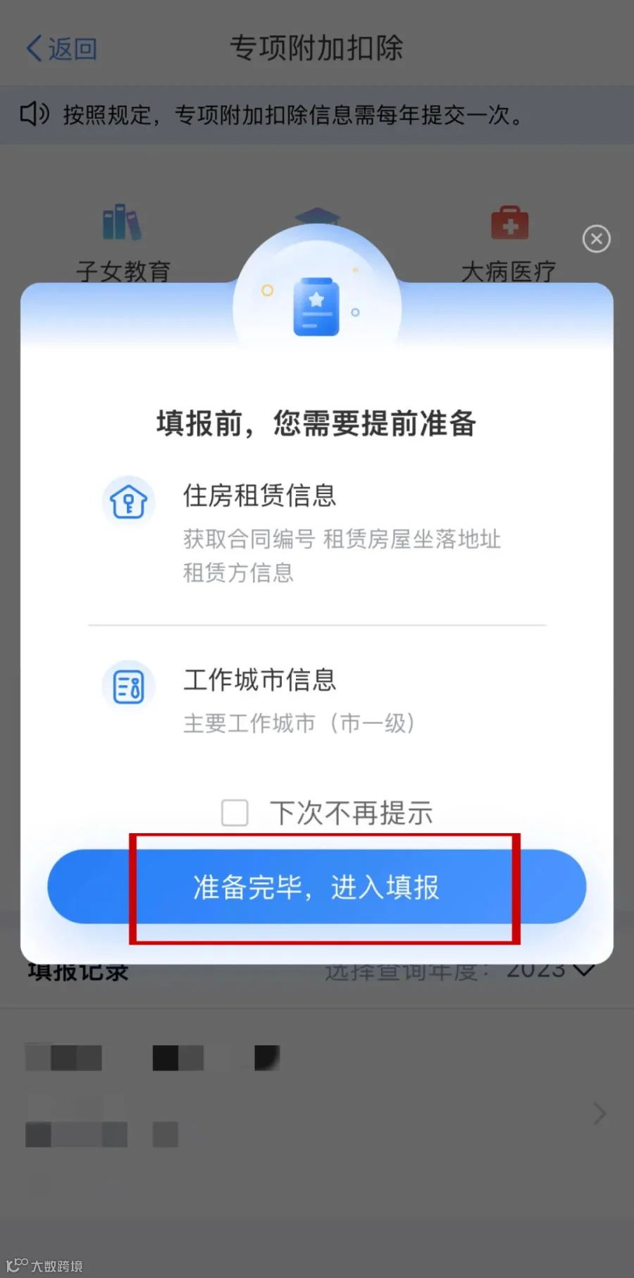点击【住房租金】→选择扣除年度→【准备完毕,进入填报】;