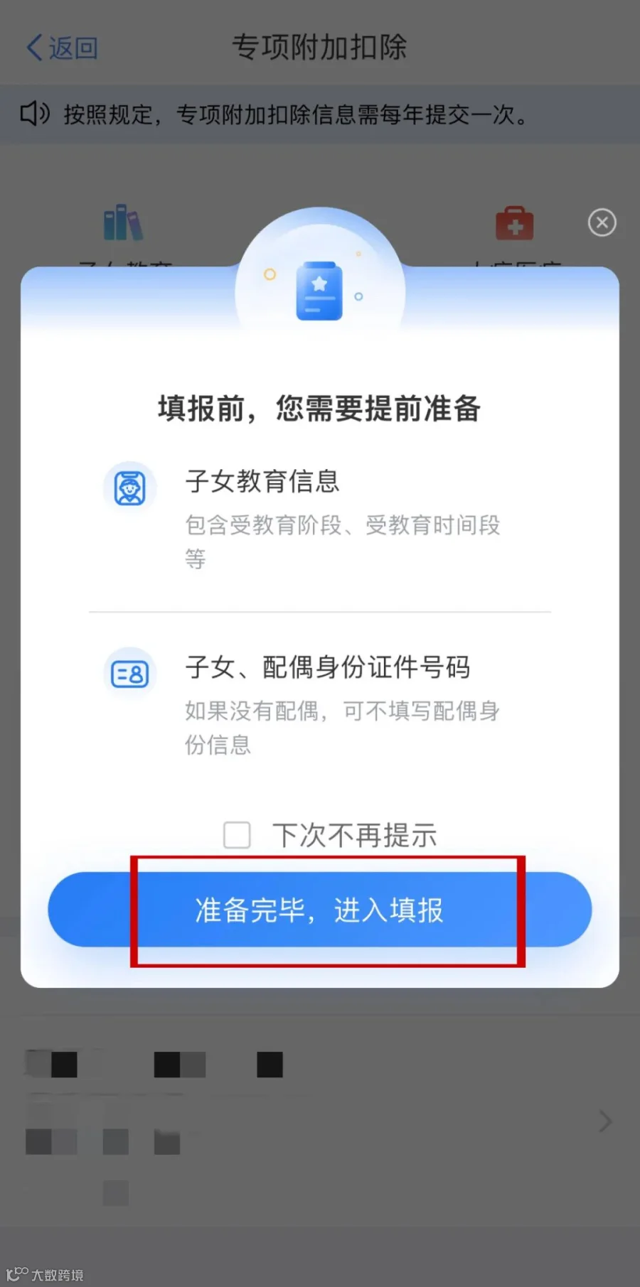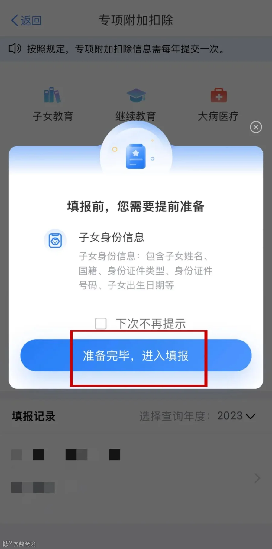 点击【子女教育】→选择扣除年度→【准备完毕,进入填报】;