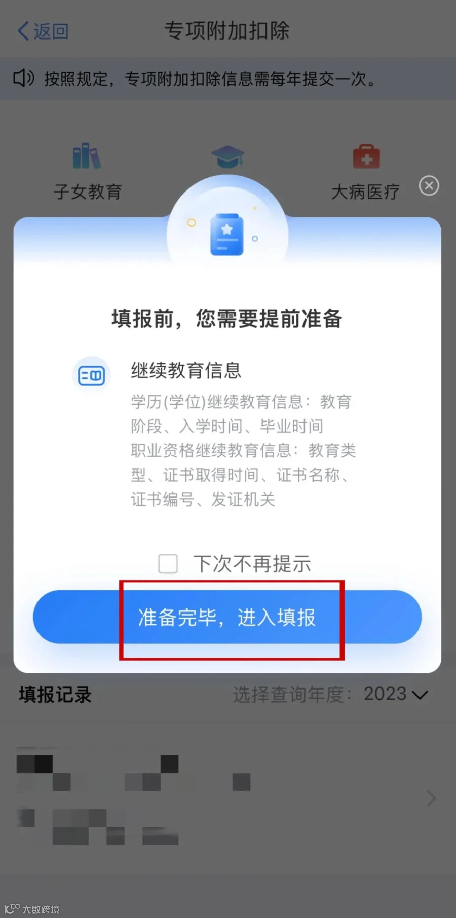 点击【继续教育】→选择扣除年度→【准备完毕,进入填报】;