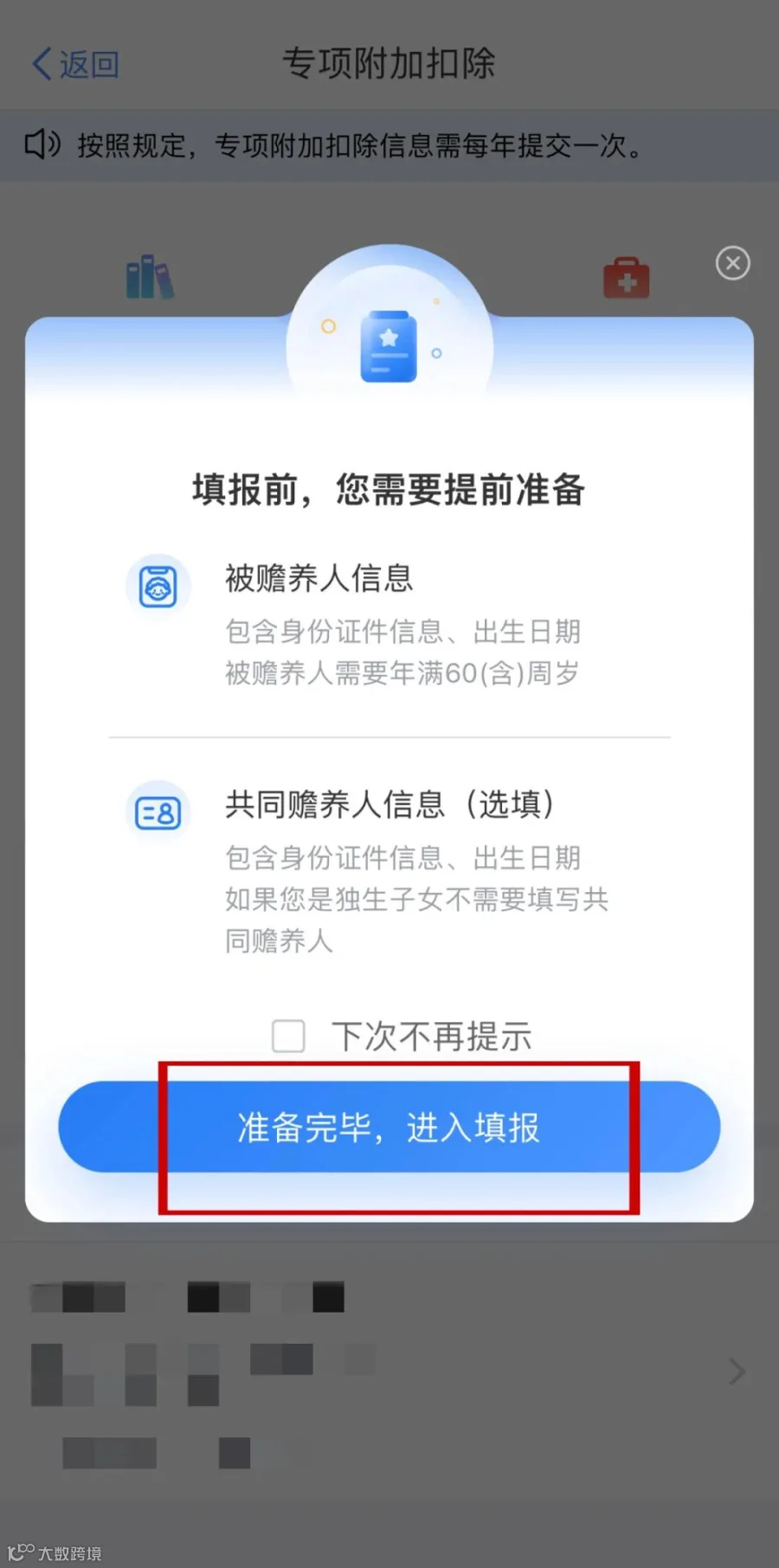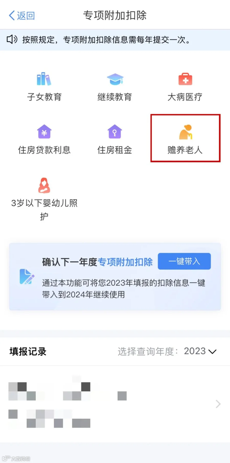 点击【赡养老人】→选择扣除年度→【准备完毕,进入填报】;