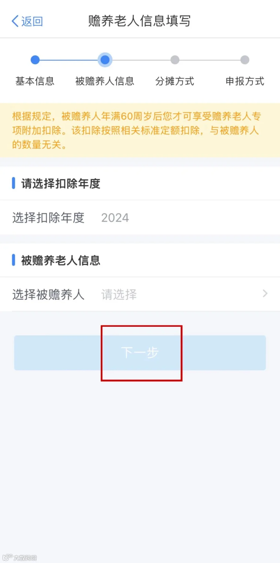 根据实际情况填写被赡养人信息,根据系统提示点击【下一步】;