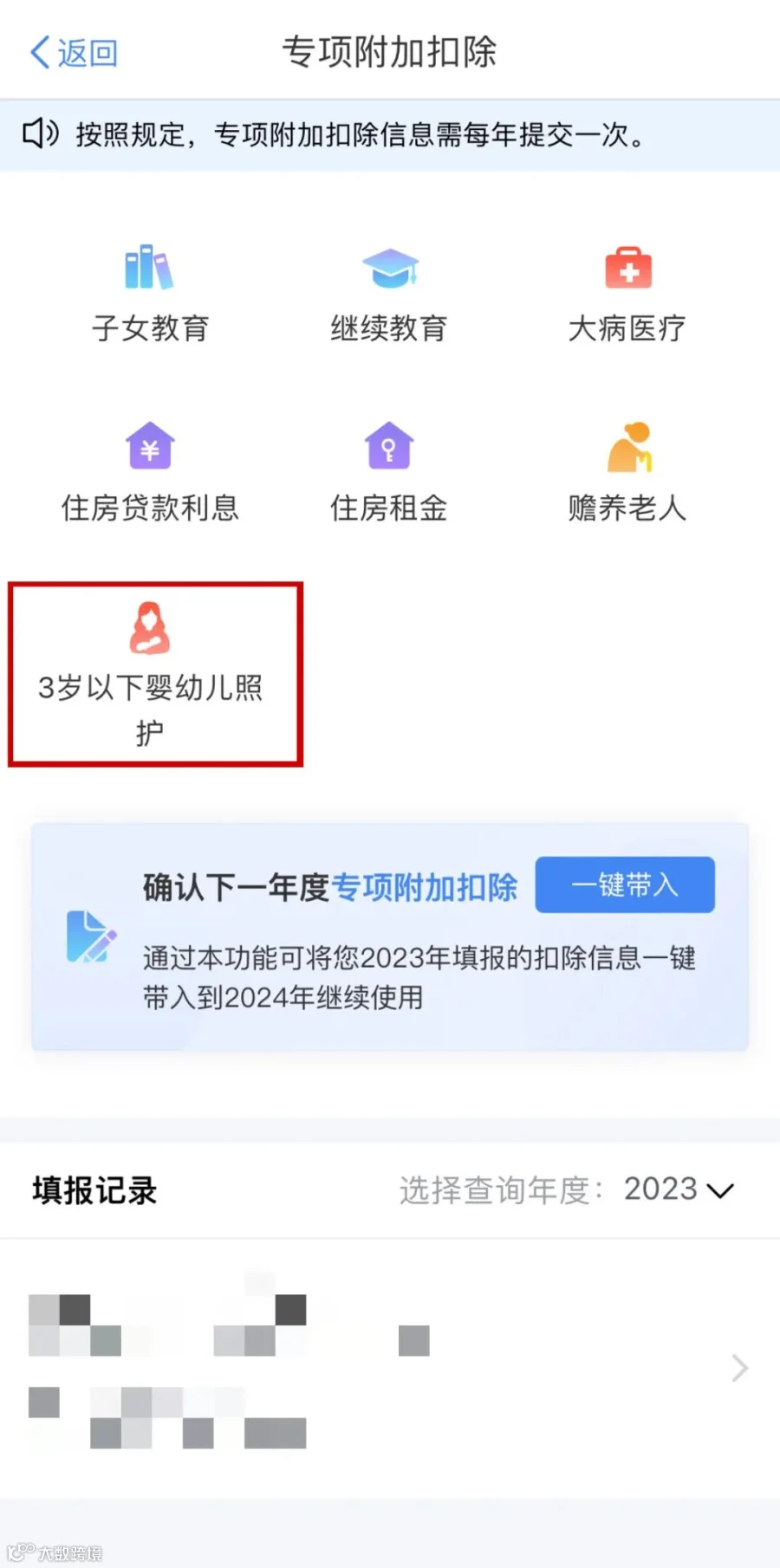 点击【3岁以下婴幼儿照护】→选择扣除年度→【准备完毕,进入填报】;