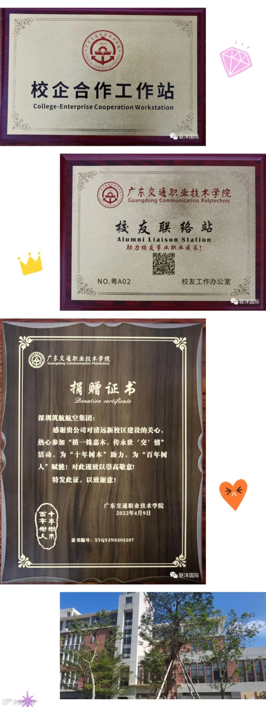 正东建设集团、深圳筑航航空集团、广州联洋国际船舶管理有限公司作为优秀校友企业,校企合作单位,与学院长期保持着良好的合作关系,并取得了卓有成效的工作成果,集团董事长、公司主管领导相继聘请为广东交通职业学院校友会副会长、海事学院校友会副会长,聘期 5 年。