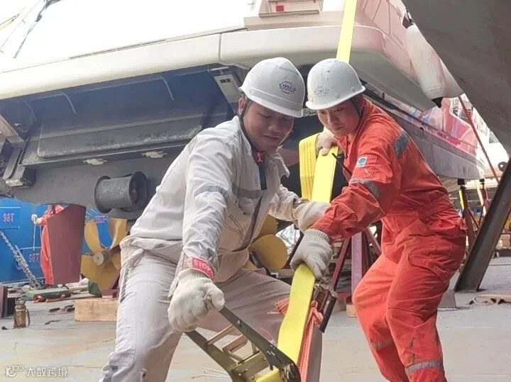 登轮后,梁柱威对照绑扎方案迅速组织团队进入战斗状态,不仅亲自带领船员开展绑扎作业,还耐心传授绑扎技巧。作业期间,面对双体船艇底支撑重达近1吨,单凭人力至少需要4 - 5人才能抬动的难题,两位同事展现绝活,灵活运用叉车操作技能,将原本耗时费力的工序变得高效精准起来。团队每天清晨登船舶作业,深夜凌晨才结束工作下地休息,持续5 个昼夜鏖战。团队凭借精湛的专业技术和丰富的实战经验,不仅配合港口船长出色地完成了各项装货与绑扎任务,还在确保安全质量的前提下,从紧凑的工期中为“大德”轮抢出了整整一天的宝贵船期。