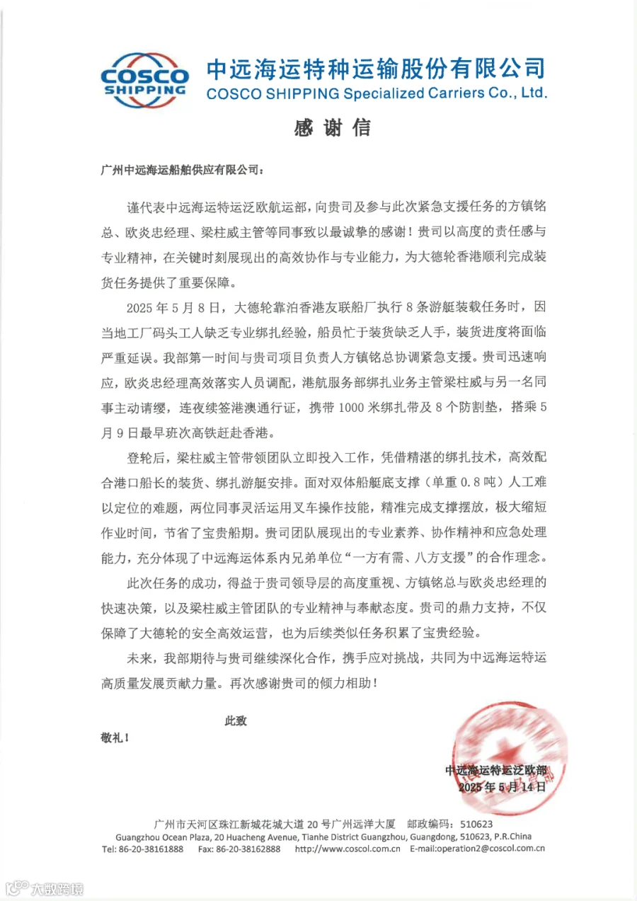感谢信中写道:“贵司团队展现出的专业素养、协作精神和应急处理能力,生动诠释了中远海运体系内‘一方有需、八方支援’的协同理念。”