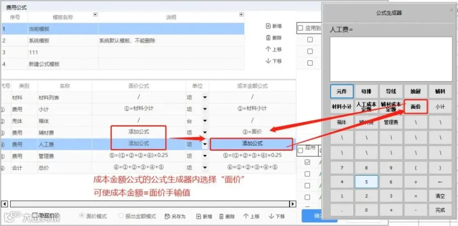 模式1的面价模式,公式设置中,成本金额公式的公式生成器内,增加【面价】选项,可使成本金额=面价。