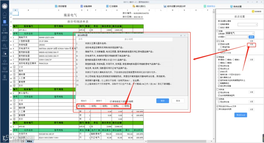 报价说明增加多个说明,可保存5个自定义说明,客户按需选择。