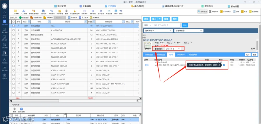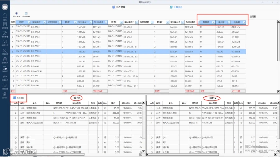 还可以看到两个项目同个箱柜不同品牌的型号明细,