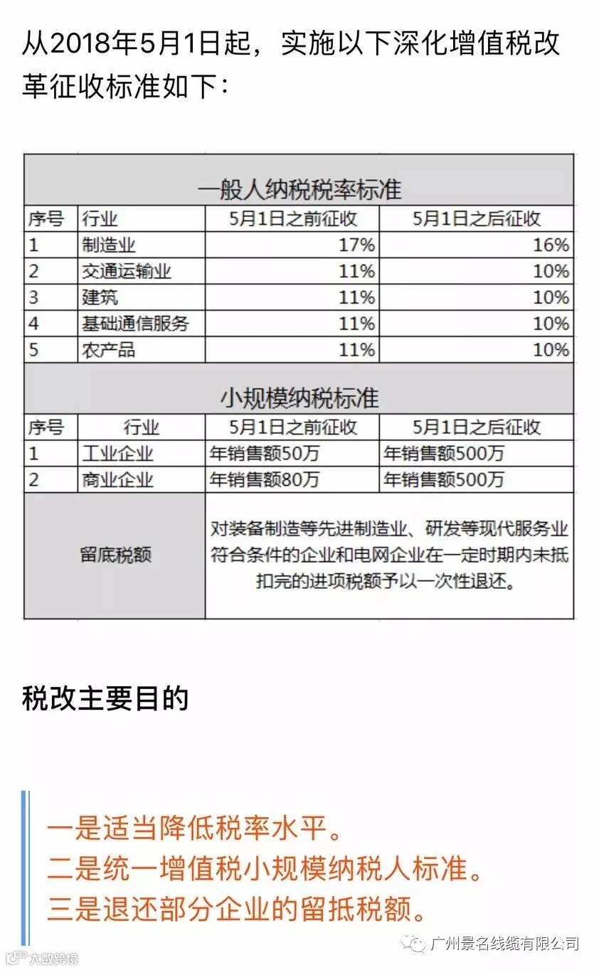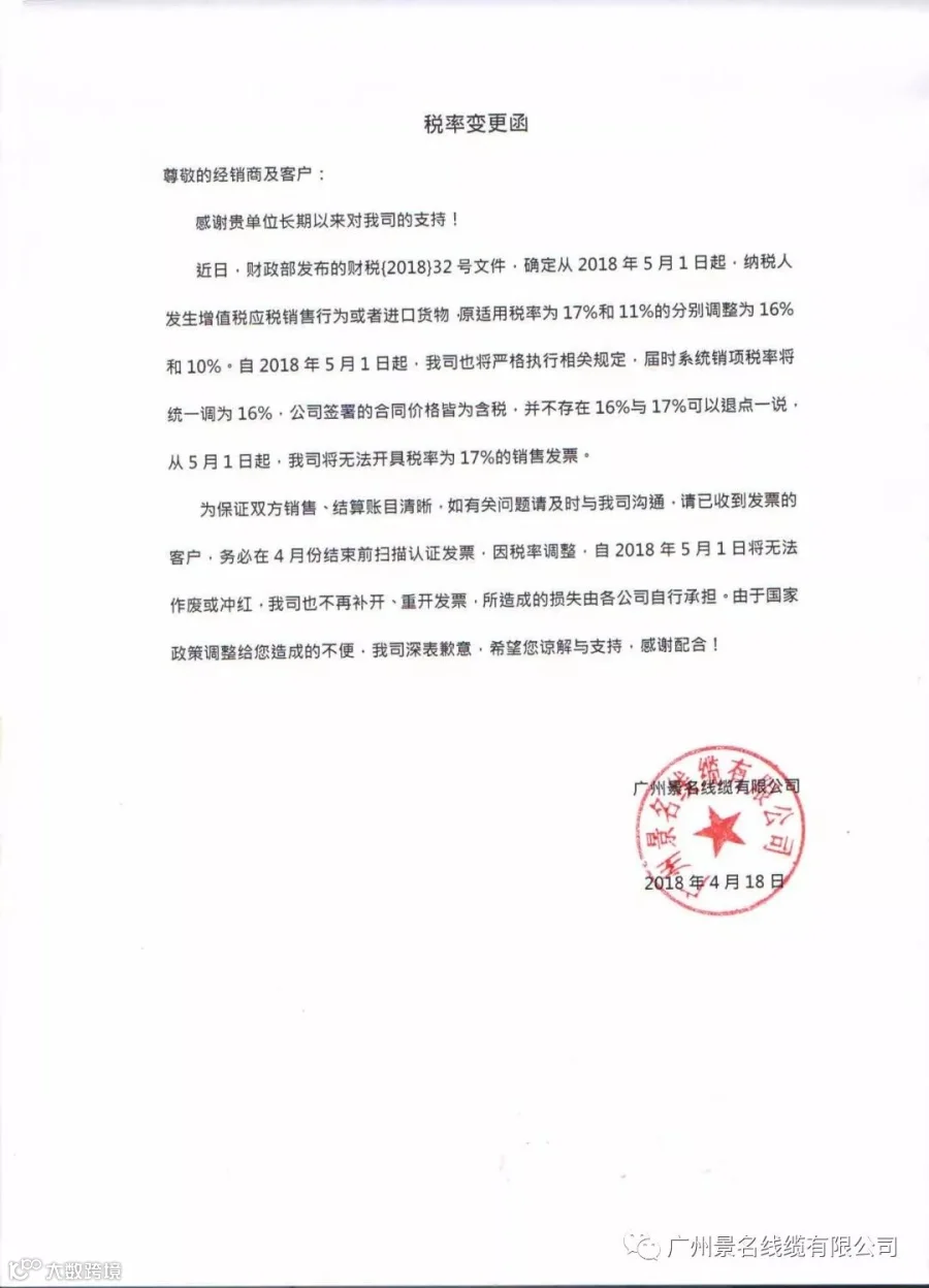 近日,财政部发布的财税{2018}32号文件,确定从2018年5月1日起,纳税人发生增值税应税销售行为或者进口货物,原适用税率为17%和11%的分别调整为16%和10%。自2018年5月1日起,我司也将严格执行相关规定,届时系统销项税率将统一调为16%,公司签署的合同价格皆为含税,并不存在16%与17%可以退点一说,从5月1日起,我司将无法开具税率为17%的销售发票。