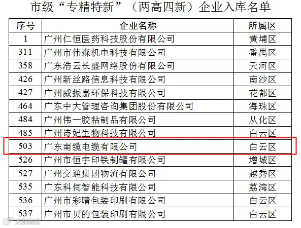 继广东南缆电缆有限公司获得国家级专精特新·“小巨人”称号后,业界及广大新老客户对南缆的关注、信赖与支持热度在上升;近日广东南缆电缆有限公司又又又获市级“专精特新”(两高四新)企业称号。