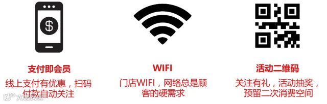 “老板,你们家WIFI密码是多少?”世界上最痛苦的事情,莫过于给你一台手机,但是它却没有网。餐饮服务业有一个共同的特性,客户在店内待的时间较长,而且因为商圈架构问题,有些门店常年没有网络信号。那么到店又找到了一条可以帮助商户跟用户建立连接的好渠道。只要购买一台常见的通过账号密码就能使用WIFI的路由。然后登陆微信公众号官方后台添加WIFI设备后,就可以下载WIFI二维码。将它贴到合适的地方,客户扫码即可连接WIFI,连接成功就会激活关注公众号功能。