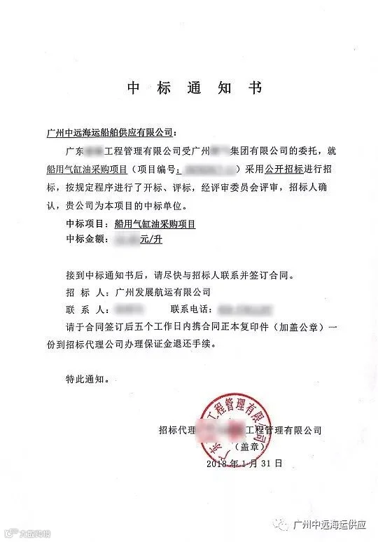 2018年1月31日上午,供应公司接到了一纸沉甸甸的《中标通知书》,将获得新客户广州发展航运有限公司未来三年的润滑油供应合同。这是公司在新的一年新业务拓展继PPG项目之后又一亮点。