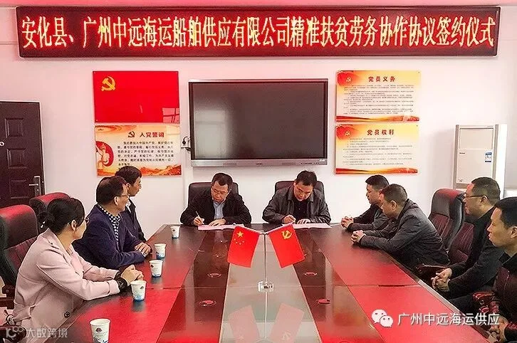 3月15日上午,供应公司与安化县人社局签订了《安化县、广州中远海运船舶供应有限公司精准扶贫劳务协作框架协议》,为中远海运集团加大对安化县的帮扶力度注入了一份力量。