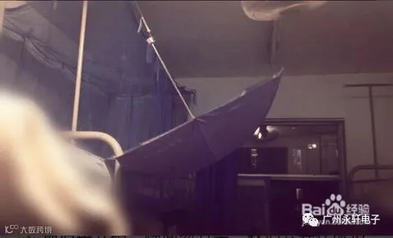3.然后我们开始实际的操作,先将量根绳子的两端绑在对面两铺的栏杆上,使两根绳在空间上平行或交叉,然后撑开一把雨伞,将其如图放置到两根绳子上就大功告成了。