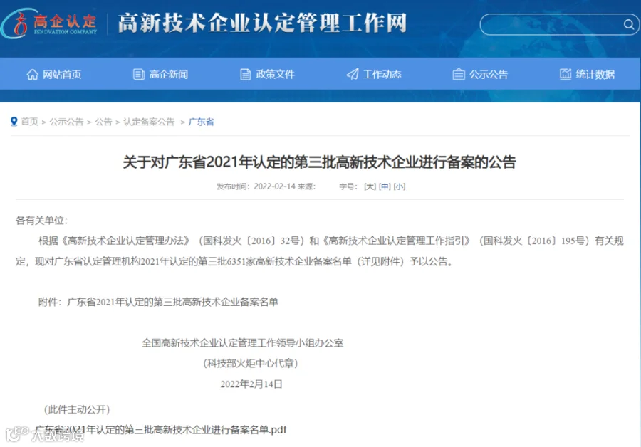 广东省高新技术企业认定管理工作网发布了《关于对广东省2021年认定的第三批高新技术企业进行备案的公告》