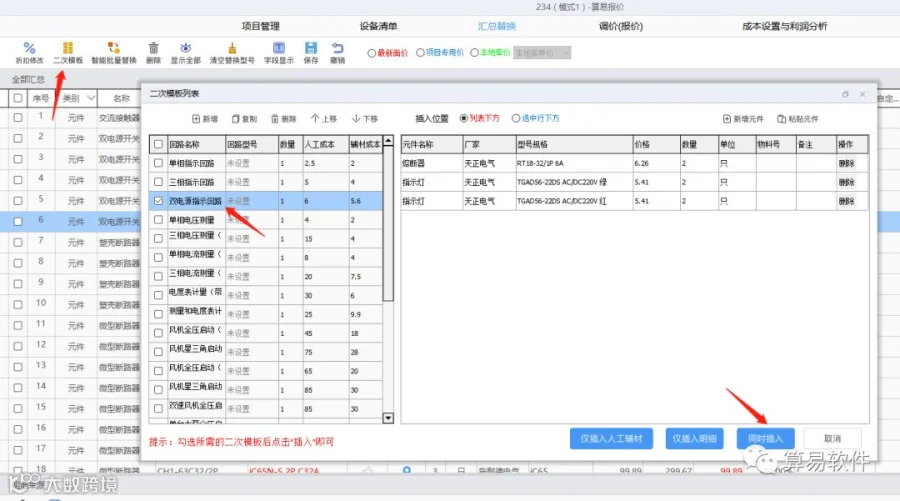 点击“二次模板”,勾选要插入的二次回路,点击“同时插入”