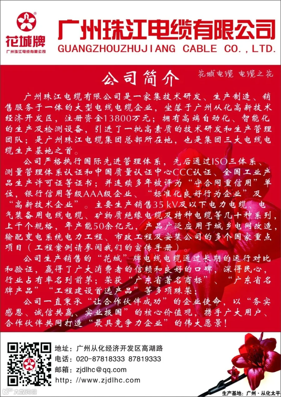 广州珠江电缆有限公司是一家集技术研发、生产制造、销售服务于一体的大型电线电缆企业,坐落于广州从化高新技术经济开发区。公司主要生产35kV及以下电力电缆等系列产品,年产能50余亿元,荣获“广东省著名商标”、“广东省名牌产品”等多项殊荣。