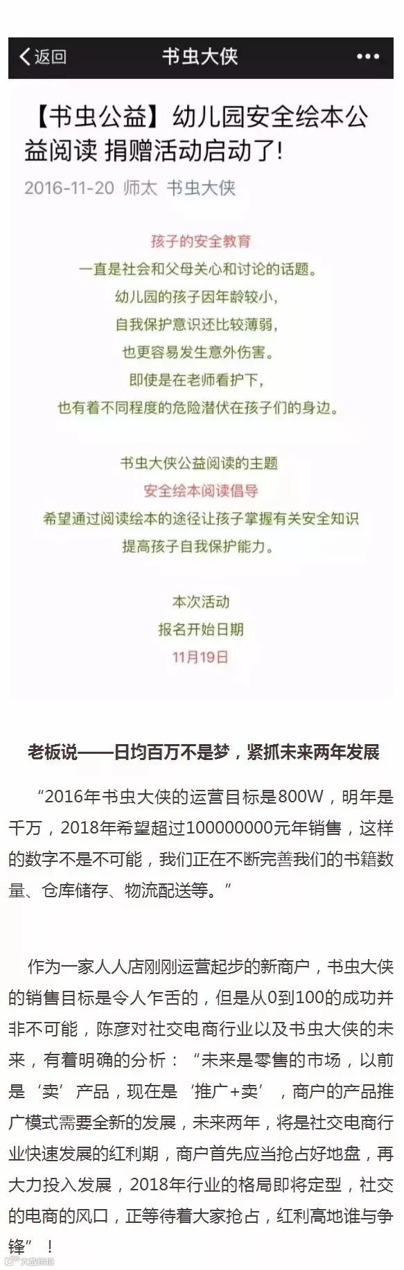 清如许科技“书虫大侠在人人店运营首月,销售额完成了200W,有人就跟我说,在社交电商行业做儿童图书,这样的成绩很好了,但他们不知道的是,在书虫大侠成立之前,我和团队已经积累多年的丰富经验,物流、渠道、仓库等全部完成,我们有能力在今年实现每天100W的销售额!”