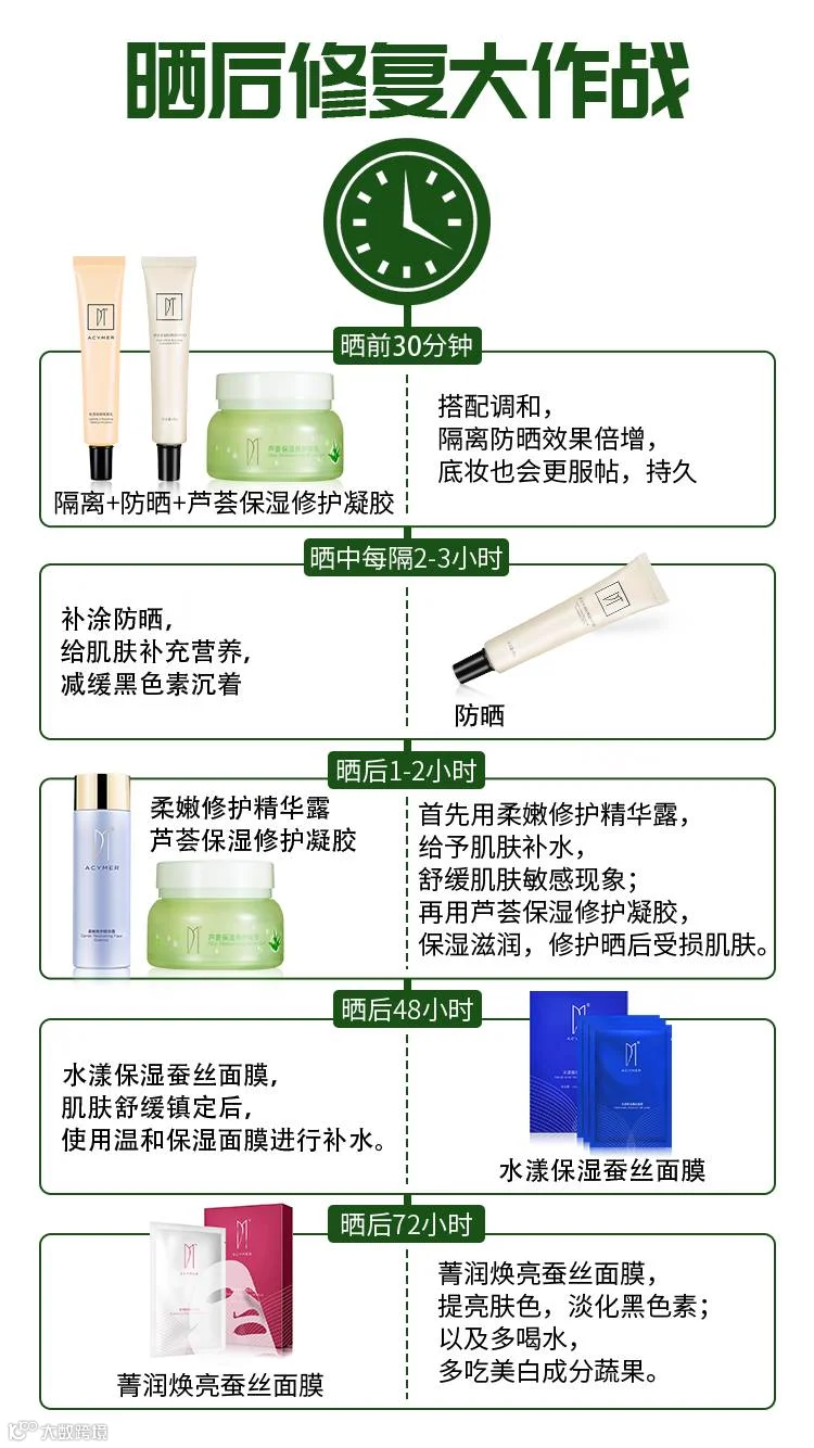防晒做得再好,也不可能百分百隔绝紫外线带来的晒黑、晒斑、皱纹等皮肤伤害。晒后的肌肤会发痒发红,不同的时间段,都有一套护肤流程。晒后1-2小时,即时使用相关产品舒缓镇静肌肤,避免出现敏感现象,1小时后使用舒缓面膜,推荐使用啫喱状的芦荟胶;晒后48小时,当肌肤镇静之后,使用洁面乳后敷上保湿面膜;晒后72小时,最好在晚间做好美白等功能型的护理。