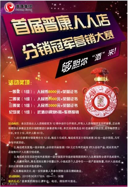 普康人人店以单品“项武酒坛藏九年”切入,三级分销利润分别为:25%、15%、10%,45天销售额约150万,开店5427家。