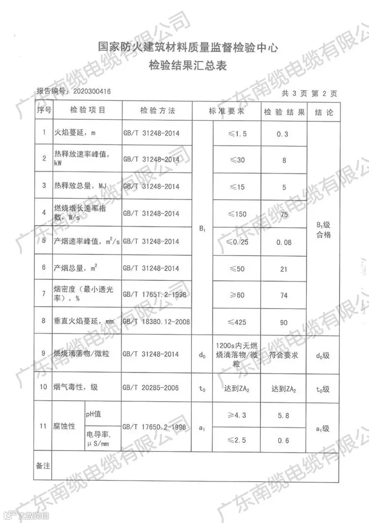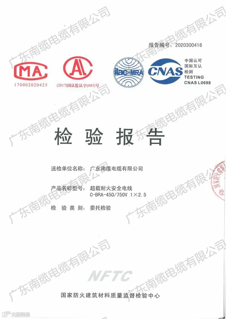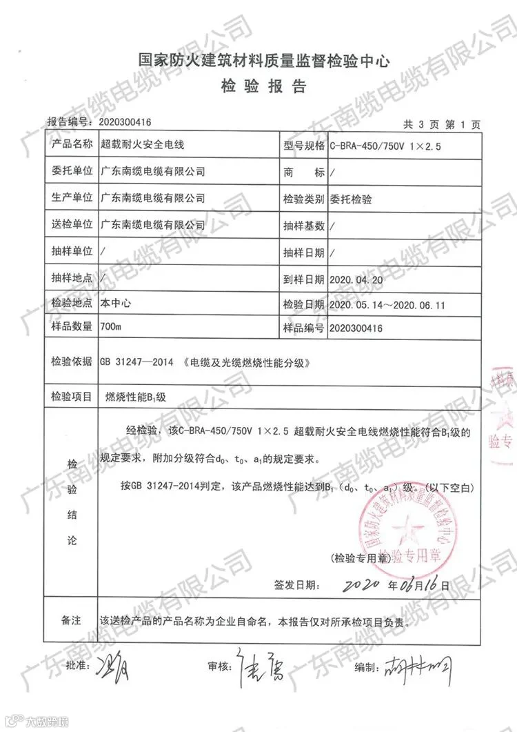 经国家建筑材料质量检验中心检验C-BRA-450/750V 1*2.5超载耐火安全电线,燃烧性能符合B1级的规定要求,附加分级符合d0,t0,a1的规定要求。