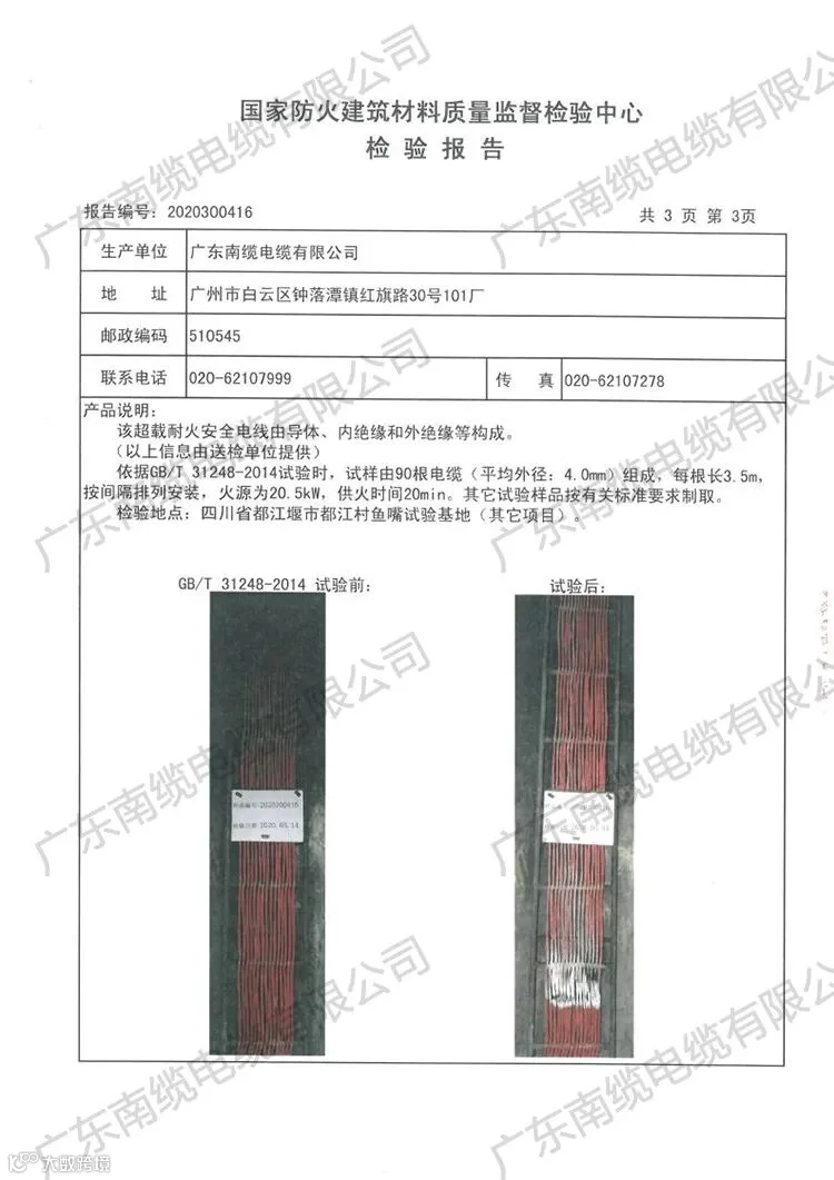 南缆电缆南缆自主研制的C-BRA 超载耐火安全电线,具有:1、超载不自燃,2、短路不燃烧,3、燃烧不短路。1000度燃烧3小时正常通电,且满足耐火(950℃)。