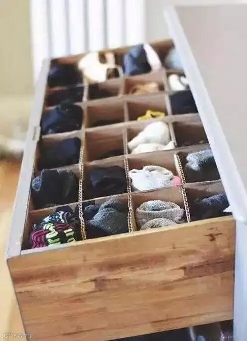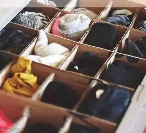 对于内衣袜子这样的小物件,容易丢,可以用平时买东西的盒子分开装起来,然后放到抽屉里,这样就不用担心找不到内衣了,也不会弄乱了整个衣柜。