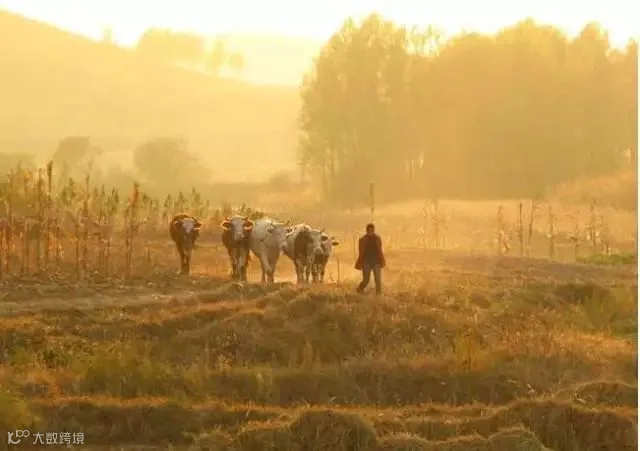 那时候牛车很流行,爷爷在前头牵着牛犁地,山清水也秀~