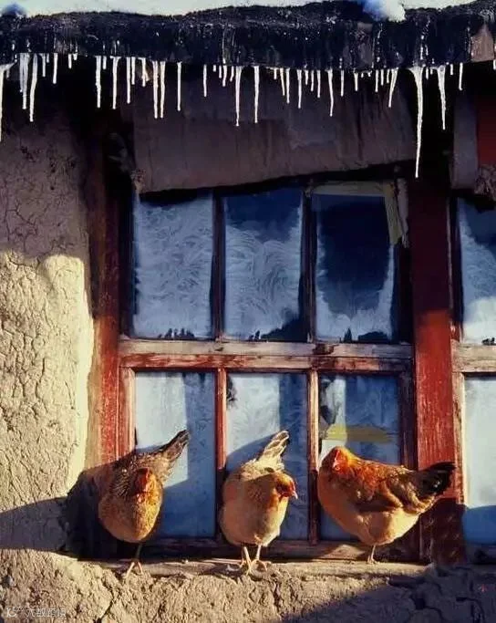 公鸡晒着冬天的太阳,每家每户都养着几只,陪着孩子一起长大。