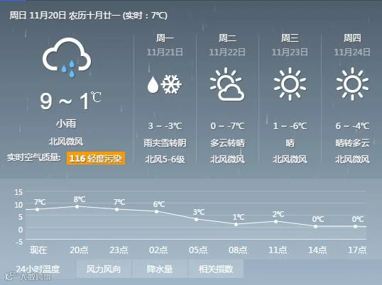受冷空气影响,预计今天下午到21日夜间,我市有小雨转雨夹雪转中雪;21日有4~6级偏北风,局地阵风可达7~8级;21日到24日各地最低气温持续下降8~12℃,23日和24日早晨最低气温降至-6~-12℃。