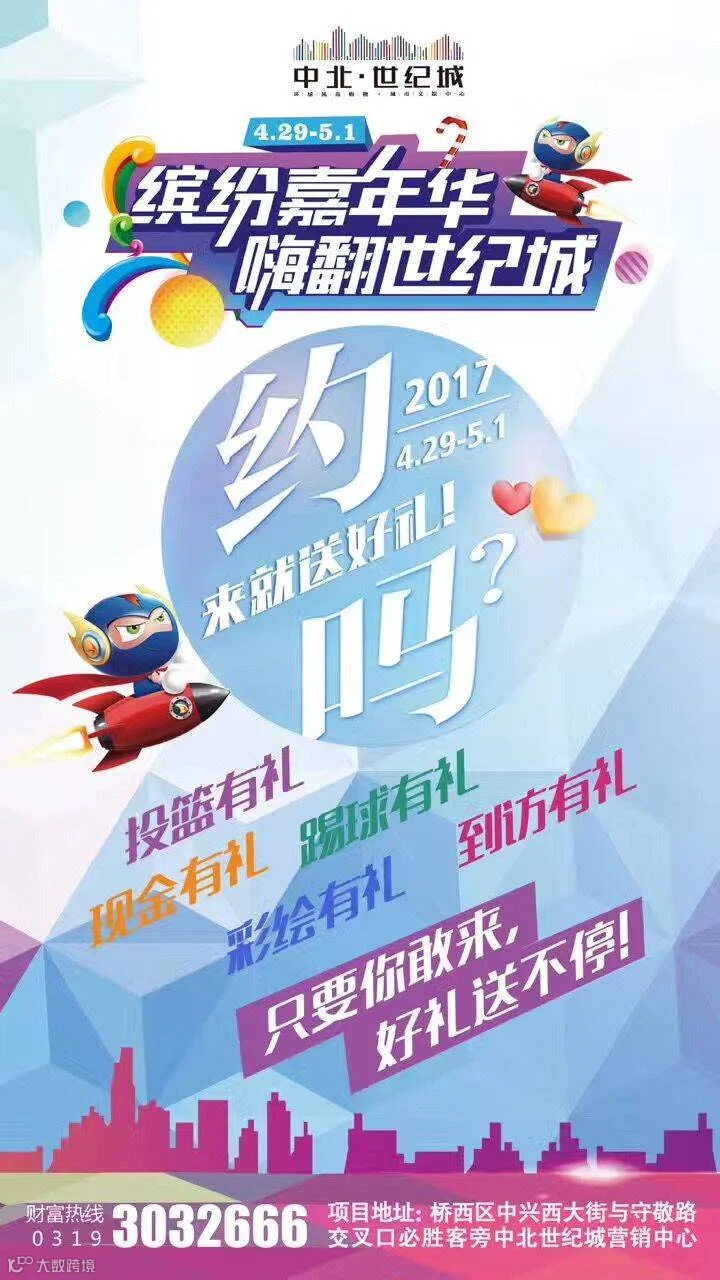 到访营销中心即可获得精美好礼,给您不一样的趣味体验,疯狂足球,射门赢好礼;花样趣味投篮,参与即送礼品;手工彩绘折扇,送您丝丝凉意 这个五一不容错过,中北世纪城等你。世纪城黄金旺铺,5万起投,最高12%回报,20万投资,月月返现2000元,投资必涨,上市中北保驾护航,稳赚零风险,财富热线3032666