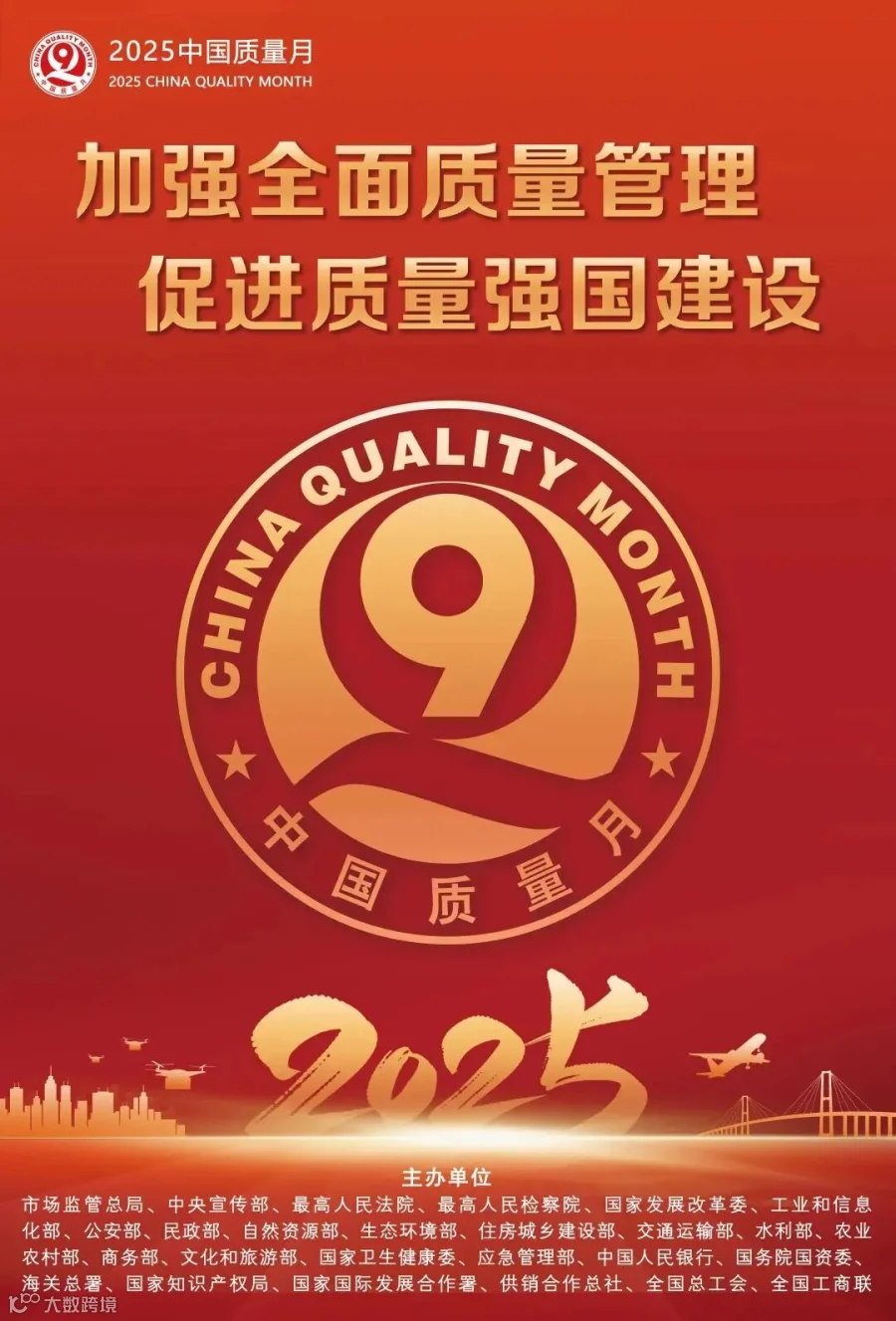 2025年9月,市场监管总局、中央宣传部、工业和信息化部等26个部门将联合开展全国“质量月”活动。今年全国“质量月”活动以“加强全面质量管理 促进质量强国建设”为主题,全面贯彻党的二十大和二十届二中、三中全会精神,落实《质量强国建设纲要》部署,大力推广科学的质量管理理念方法,深入推进质量强企、强链、强县(区、镇),提升各领域全面质量管理水平。