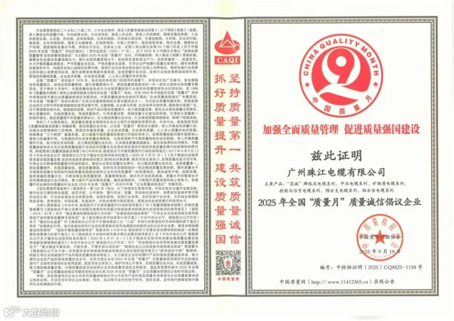 近日,在中国质量检验协会组织的2025年全国“质量月”企业质量诚信诚意活动中,广州珠江电缆凭借其卓越的品牌实力和诚信经营,荣获《2025年全国“质量月”质量诚信倡议企业》荣誉。