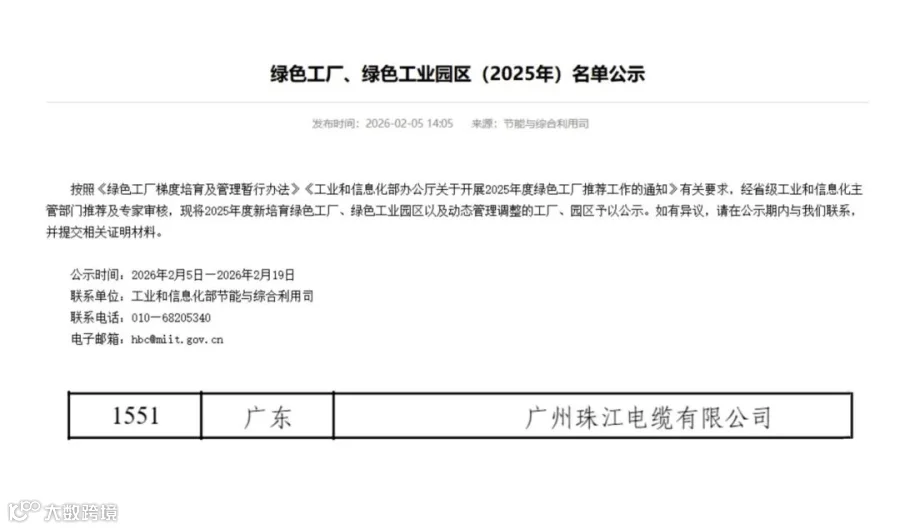 近日,工业和信息化部正式公示2025年度国家级绿色工厂名单,广州珠江电缆有限公司凭借在绿色制造、节能减排、资源循环利用等方面的卓越表现,成功入选国家级“绿色工厂”。这是对公司长期践行绿色发展理念、构建现代化绿色制造体系的国家级权威认可,标志着广州珠江电缆在推动行业绿色转型和高质量发展道路上迈出了坚实一步。