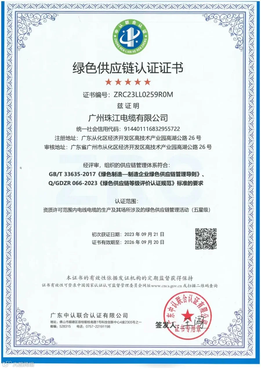 近日,广州珠江电缆有限公司获得了由广东中认联合认证有限公司颁发的《绿色设计产品评价认证证书》、《绿色供应链认证证书》,这标志着公司绿色发展的实力与水平又迈上了新的台阶。
