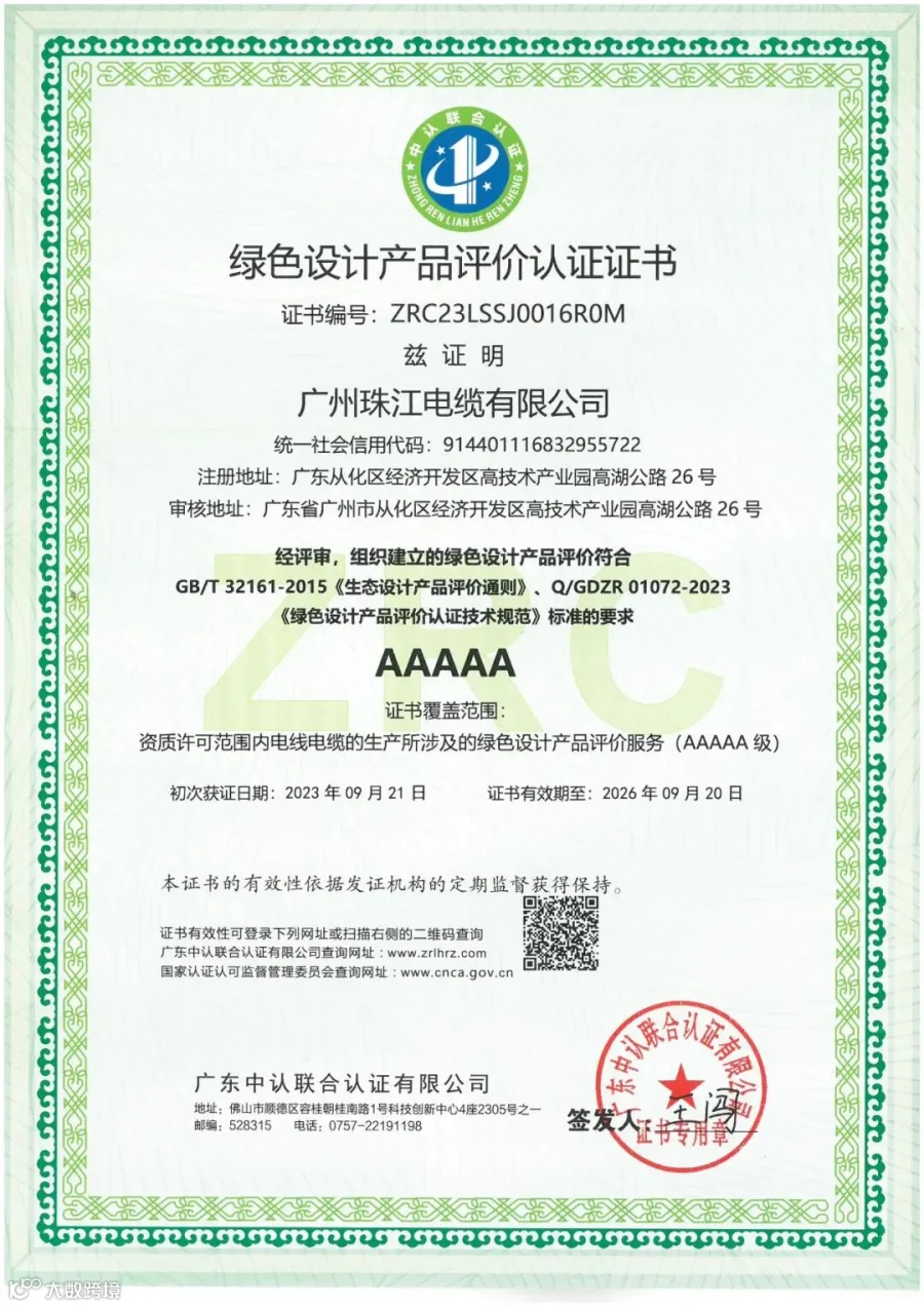 热烈祝贺广州珠江电缆荣获《绿色设计产品评价认证证书》及《绿色供应链认证证书》