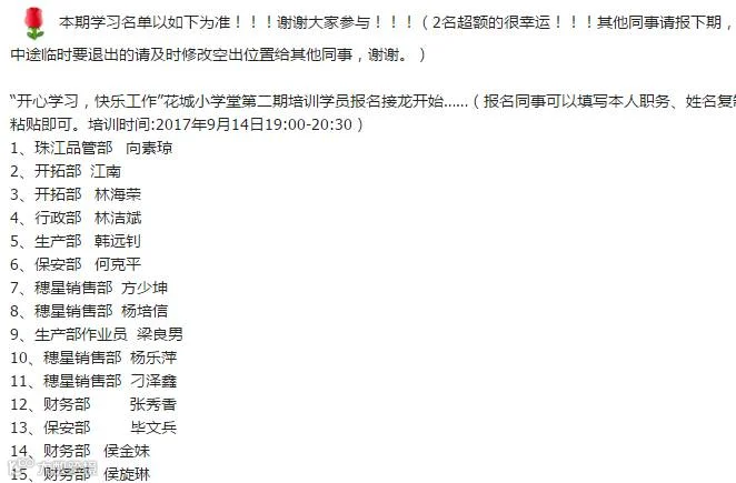 “花城小学堂”第二堂——《职业基本素养》系列一:“职业有效沟通”,在掌声与欢笑声中圆满结束。本期培训从报名接龙开始,短时间内自愿报名的人数已超过课堂预计能容纳的人数,组委会只能通知其他同事下期参加。尽管如此,有的同事为了不错过本期机会,在过道上加个位子参加培训;穗星电缆的同事们,赶路50公里来参加培训。充分显示了花城人自我提升、追求上进的良好学习心态和工作氛围。