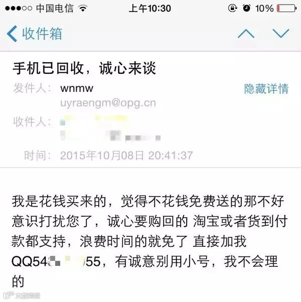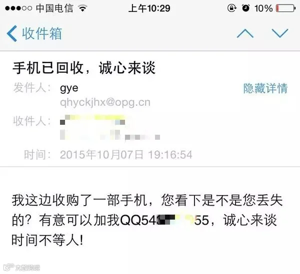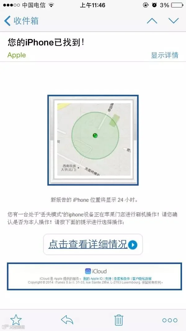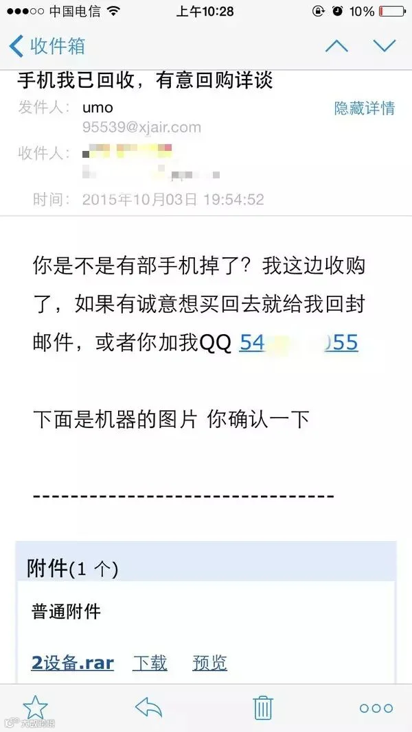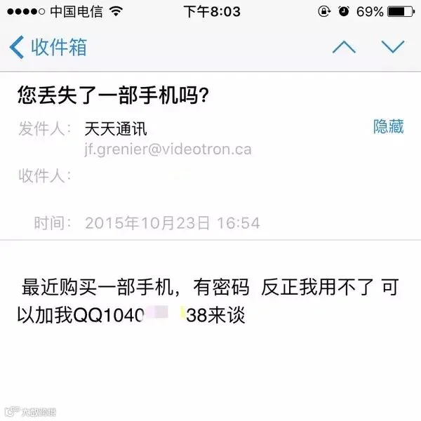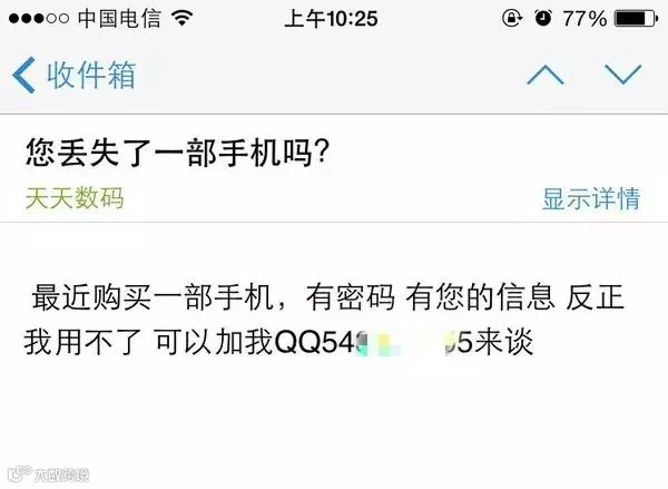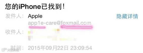 记住:苹果官网不可能用非官方地址的邮箱给客户发邮件,这用foxmail是个什么鬼?