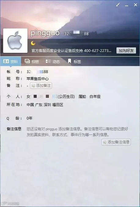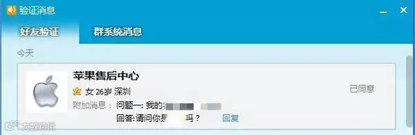 主要内容就是问我是不是丢了手机,说有一个男人拿着这部手机去售后要求解锁,但是说不出苹果 ID 的密码,他们就查到我的联系方式来联系我,如果我能确认这部手机是我的,苹果售后会扣留并归还给我(内心好激动有没有,这就是要被骗的前兆啊)她向我核对了姓名,住址,邮箱(都是她说完,我说嗯)然后问我三个密保问题还记不记得,我说最好给我发邮件,我不会在电话里说我的密保答案(还是留有几分清醒)她说如果我有疑问就可以填一个什么表,我说好,我就打开电脑准备收邮件。结果她在电话里面问我看见验证消息没,她竟然加我 QQ ,我就意识到应该是骗子了,加就加嘛。