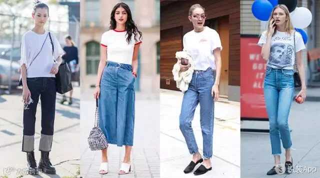 经典的T恤牛仔裤,搭配拖鞋,新颖的搭配,