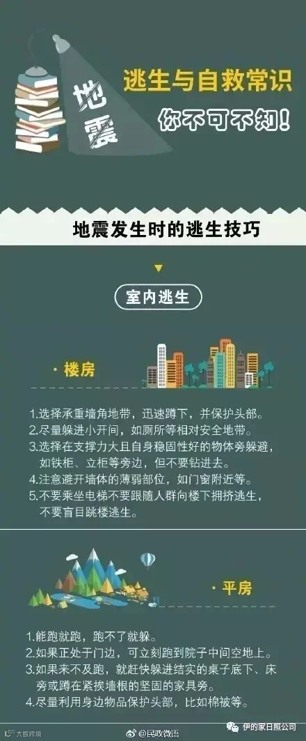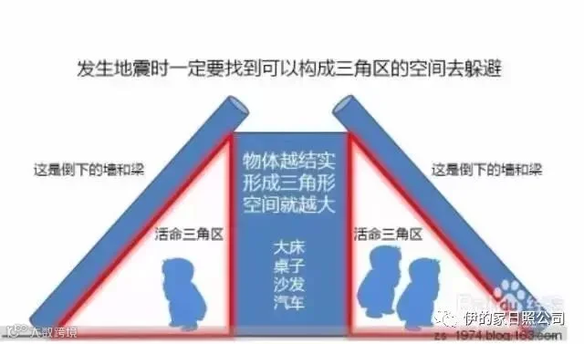 迅速远离外墙及门窗,房可选择厨、浴室、厕所等开间小、不易塌落的空间避震,千万不要跳楼,也不能使用电梯。尽量不要躲在木质桌子底下,或者床底下,而应该躲在坚固家具的旁边,衣柜墙角边是比较安全的。当建筑物倒塌时,落在物体或家具上的屋顶的重力会撞击这些物体,使得靠近它们的地方留下一个空间。这个空间就是被称作的“生命三角”。