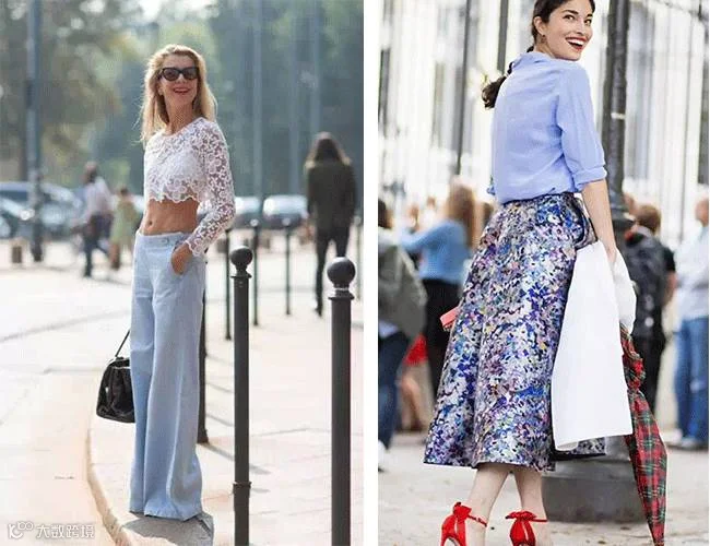 ▼蓬松的下装可以修饰过窄的跨部,选择蛋糕裙或者伞摆裙,不要贴身的牛仔裙或A字裙;裤装的话最好选择宽松点的,深色系的裤子,像灯笼裤。