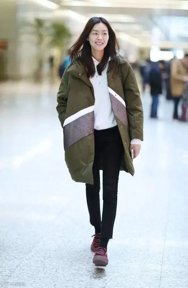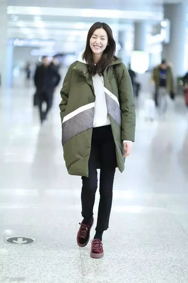 绿色羽绒还跟红色鞋子来个大胆的“红绿撞”