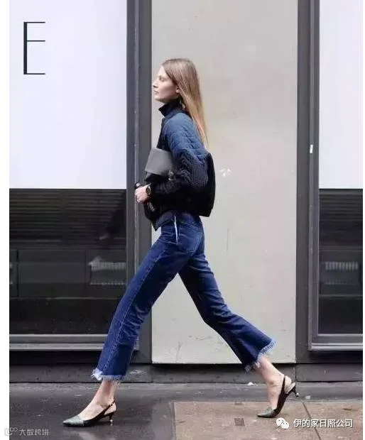 露后跟猫跟鞋搭配时下流行的各种毛边、拼接牛仔裤。