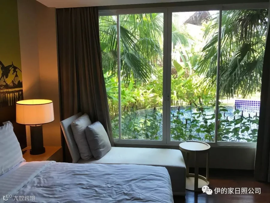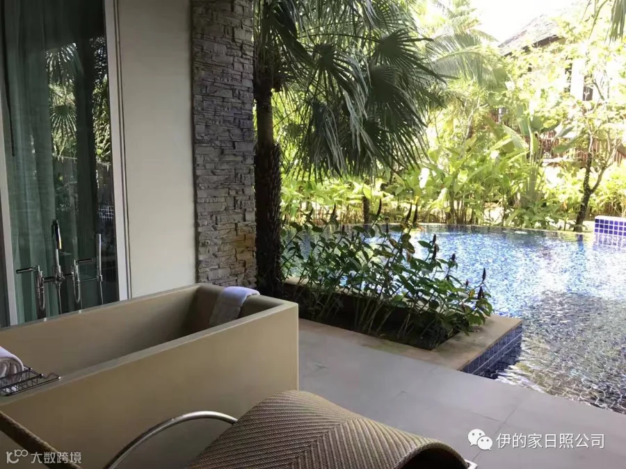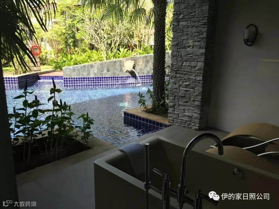 飞快到达酒店, 阳台有躺椅和浴池,外面连着游泳池,卧室外面就是泳池