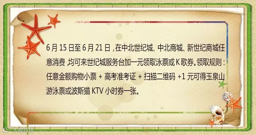 导读:世纪城购物中心高考党福利钜惠来袭······时间6月15日-6月21日【活动一】半价就餐参与商家【活动二】1