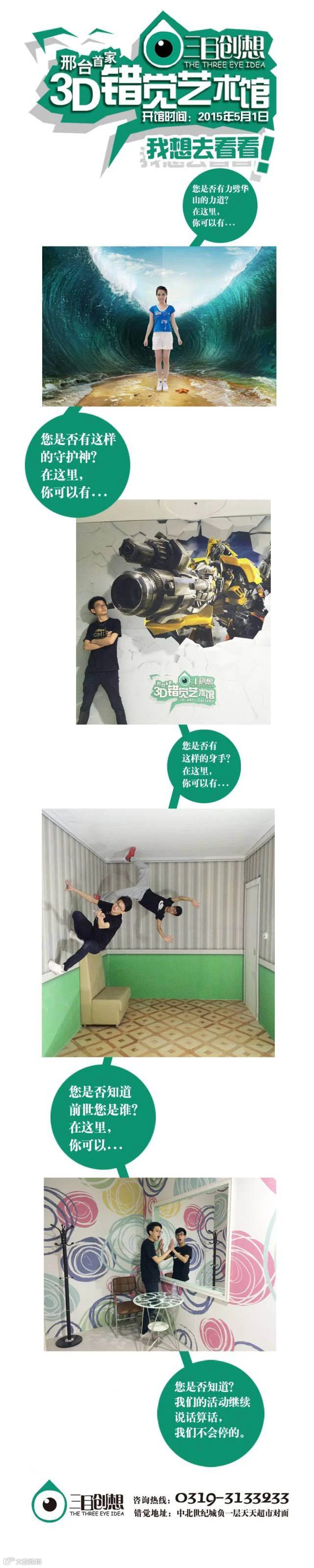 不知何时3D电影技术已经被人们所喜爱,也不知何时3D画被人所熟知,而错觉艺术也开始走入人们的视线,从首都到省会,距离我们是如此的遥远,今天,如果您想一览3D错觉艺术,就走入我们,邢台首家3D错觉艺术馆。这将是一次零距离接触3D艺术的机会,带上小伙伴一起体验“前世今生镜”的神秘、领略“魔幻3D艺术展”的魅力、感受“杰克逊45度房间”的神奇、探索“重力逆转室”的奥秘、还可以走进“进击的巨人室”一起享受“小霸王怀旧游戏”的欢乐!“五一”来中北世纪城”三目创想 3D错觉艺术馆”,享专属于邢台人自己的3D错觉艺术盛宴!