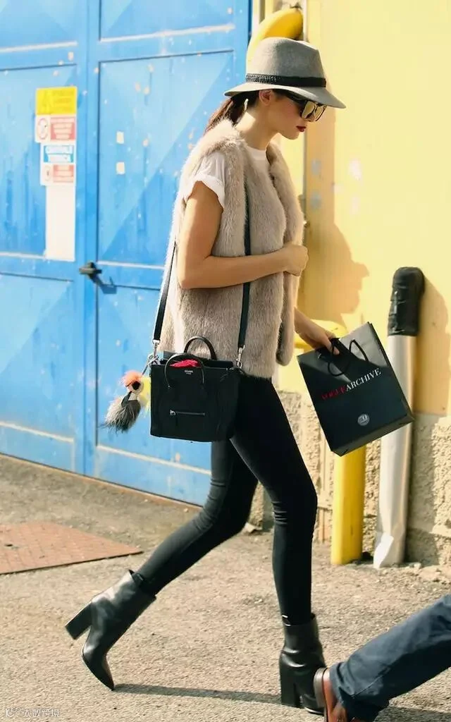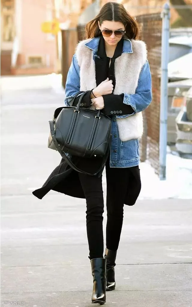 牛仔相信很多的人衣橱都有上款,一身牛仔外搭上充满暖意的皮草马甲时髦又有范儿,而黑色裤装搭短靴轻松拉长腿部线条。