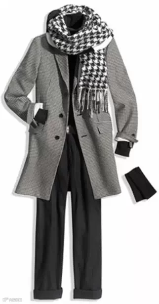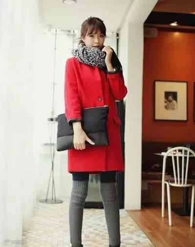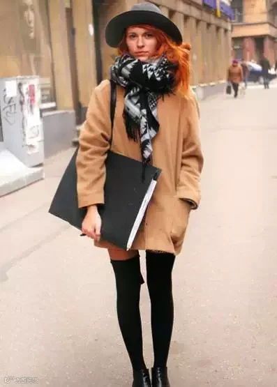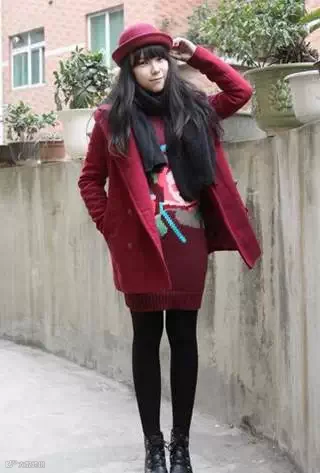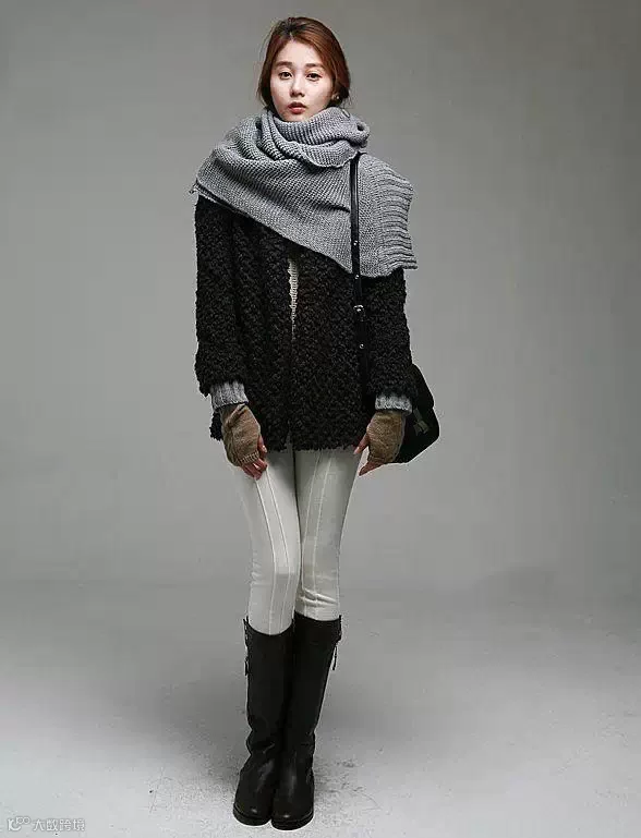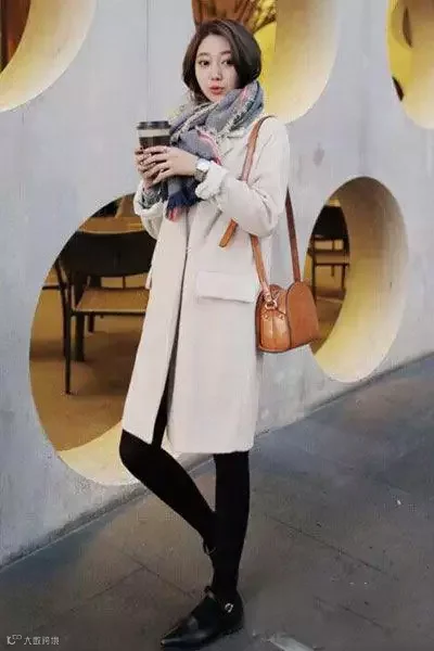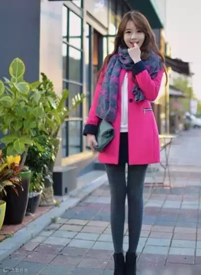 可以是黑色,灰色,也可以是红的.或者是花的,搭配一条浅粉、米白织成的比较有质感的围巾!把注意力集中到了上部,显的人更高挑些!